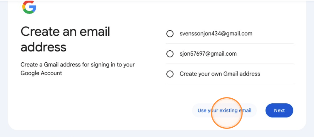 This is the step most people miss. Google defaults to creating a new Gmail address. You must explicitly select the existing email option to bypass that flow entirely.