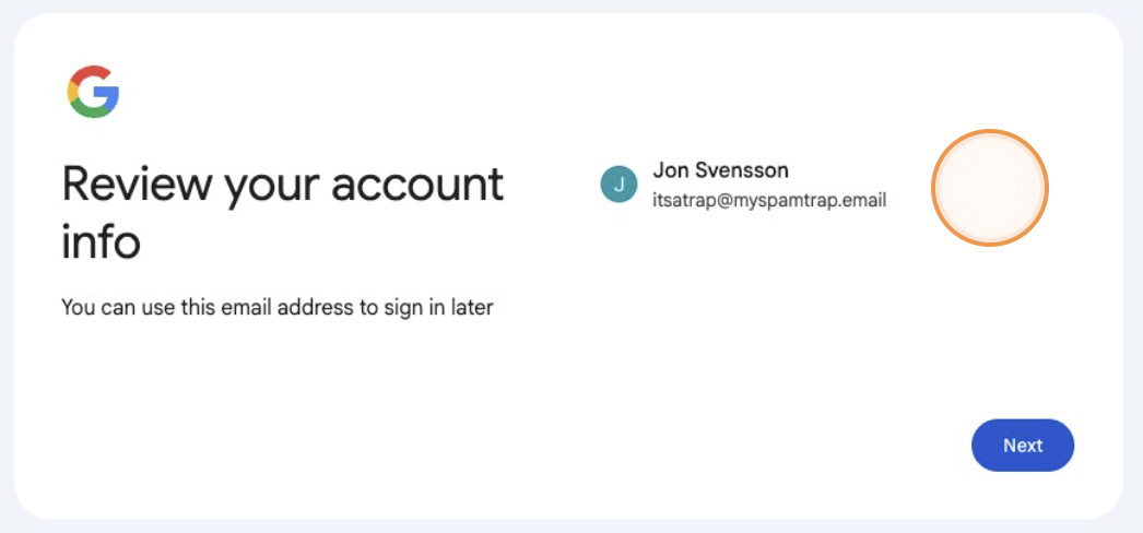 12. Review your account info — confirm the name and email address shown are correct, then click "Next."